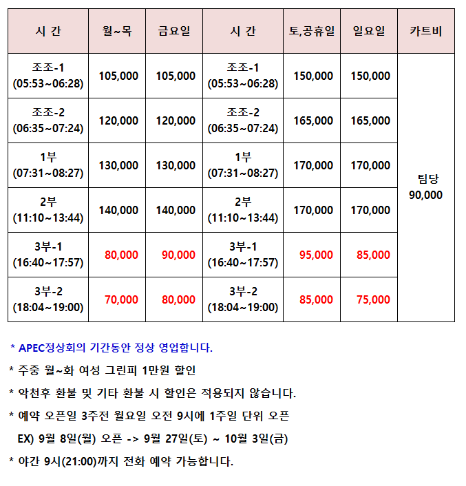 2025년 10월 티오프 시간 및 이용요금 안내 25. 10. 13 ~ 10. 31