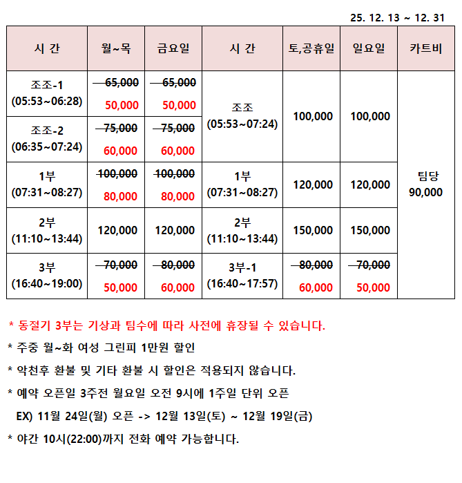 2025년 12월 티오프 시간 및 이용요금 안내 25. 12. 13~ 12. 31