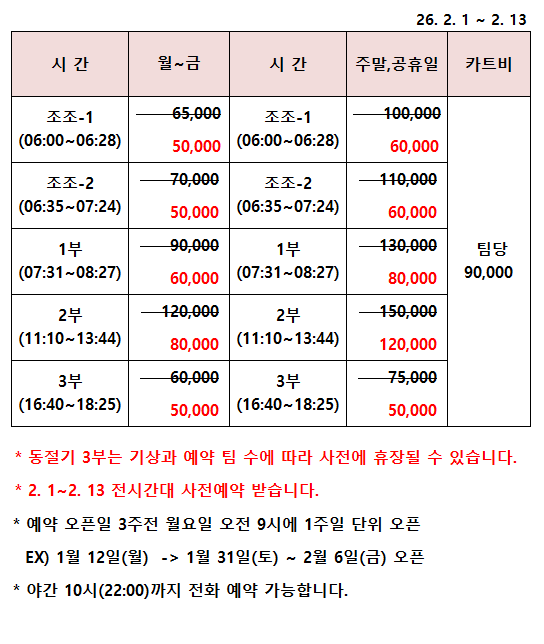 2026년 2월 티오프 시간 및 이용요금 안내 26. 2. 1 ~ 2. 13