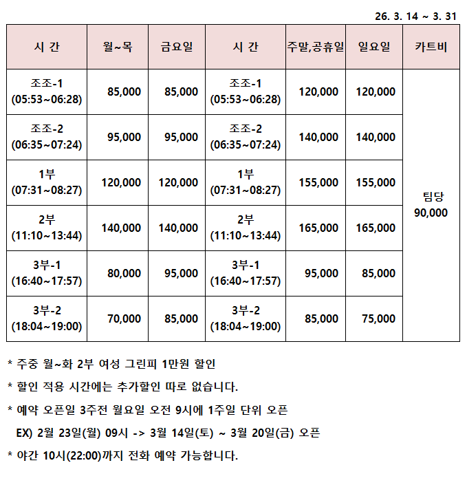 2026년 3월 티오프 시간 및 이용요금 안내 26. 3. 14 ~ 3. 31