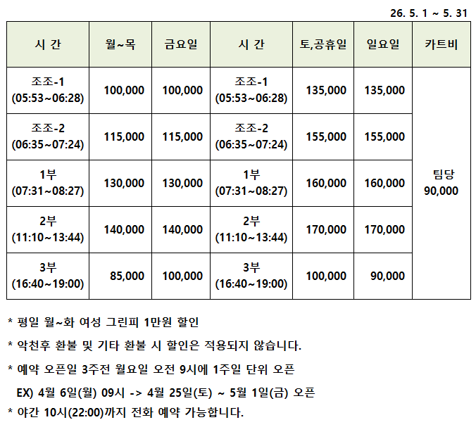 2026년 5월 티오프 시간 및 이용요금 안내 26. 5. 1 ~ 5. 31